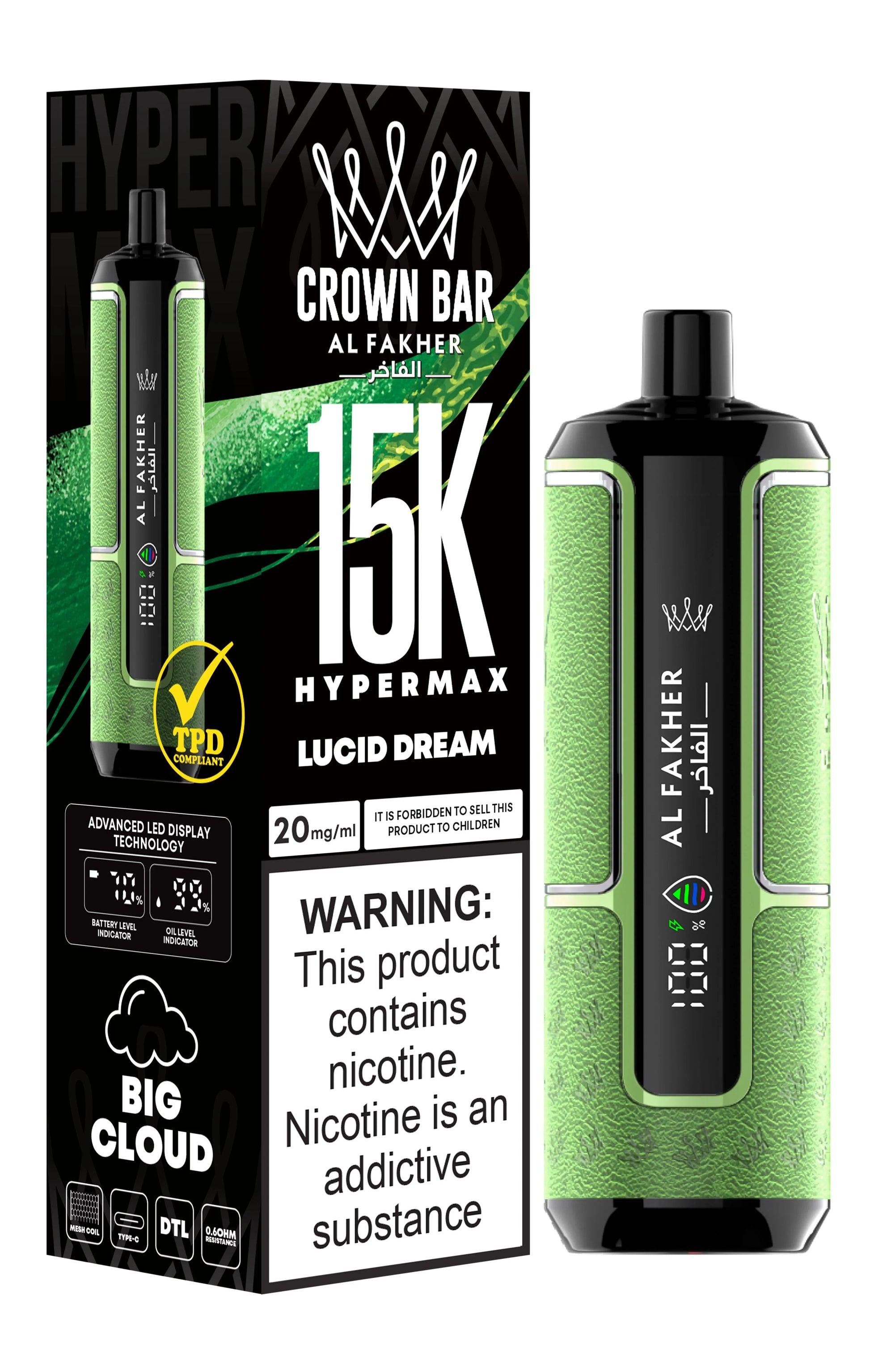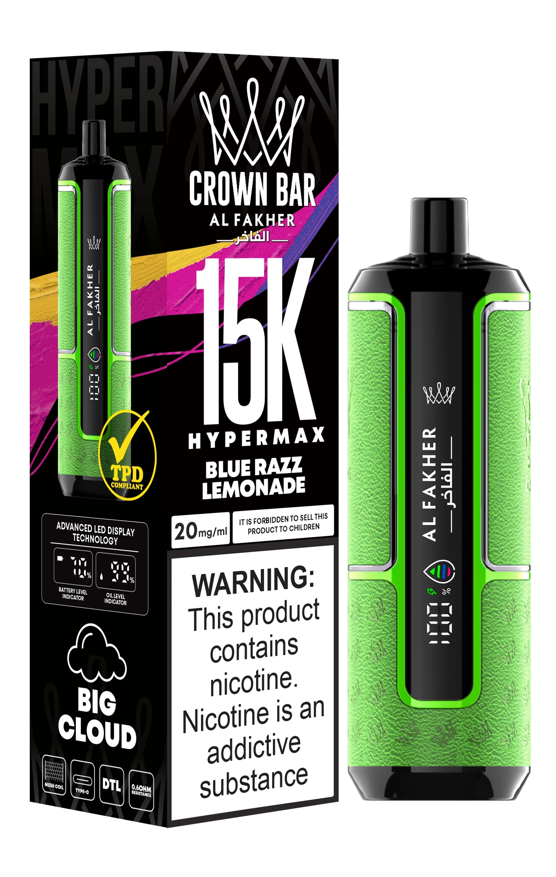 - The Al Fakher Crown Bar 15K Hypermax includes advanced display technology that shows both battery life and puff count, so you’re always in the know.Ready to Elevate Your Vaping Experience?